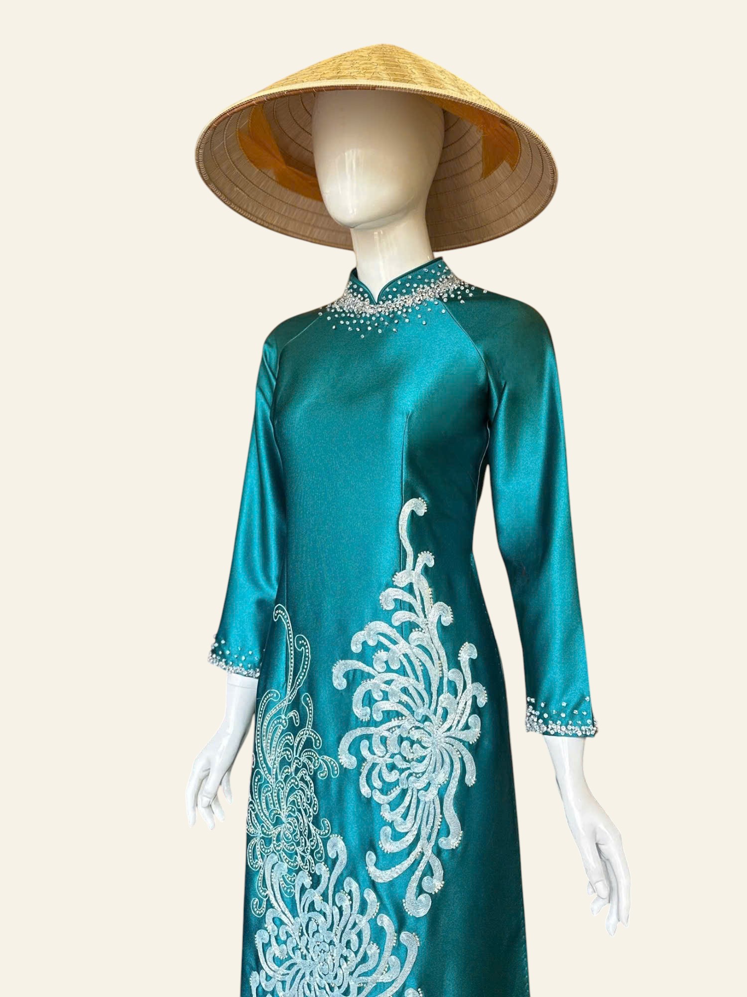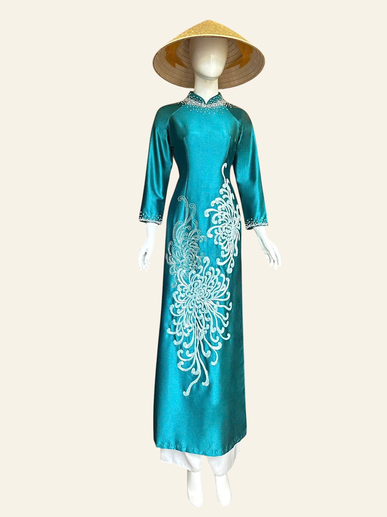 Cúc mẫu đơn mang trong mình vẻ đẹp tròn đầy, ung dung và đĩnh đạc. Không rực rỡ phô trương, từng lớp cánh xếp chồng lên nhau một cách hài hòa, gợi cảm giác viên mãn và bền lâu. Trong mỹ học Á Đông, cúc mẫu đơn là biểu tượng của phú quý, thịnh vượng nhưng vẫn giữ được sự nền nã, tinh tế. Loài hoa ấy đại diện cho khí chất của người phụ nữ trưởng thành – sâu sắc, điềm tĩnh và biết giá trị của chính mình. Khi hiện diện trên tà áo dài, cúc mẫu đơn không chỉ là họa tiết trang trí, mà còn là lời chúc an lành, đủ đầy và sang trọng, lặng lẽ tỏa hương theo từng bước đi.
