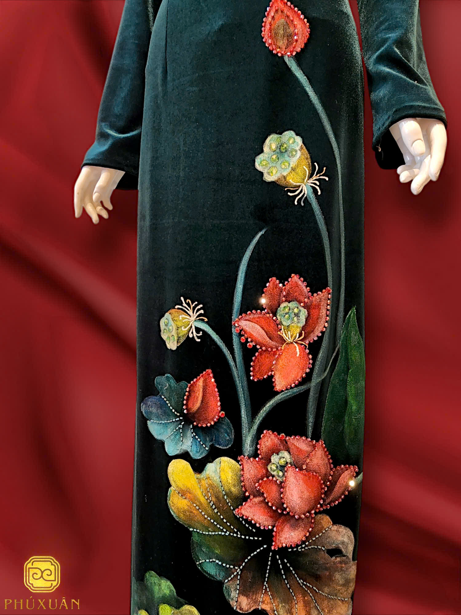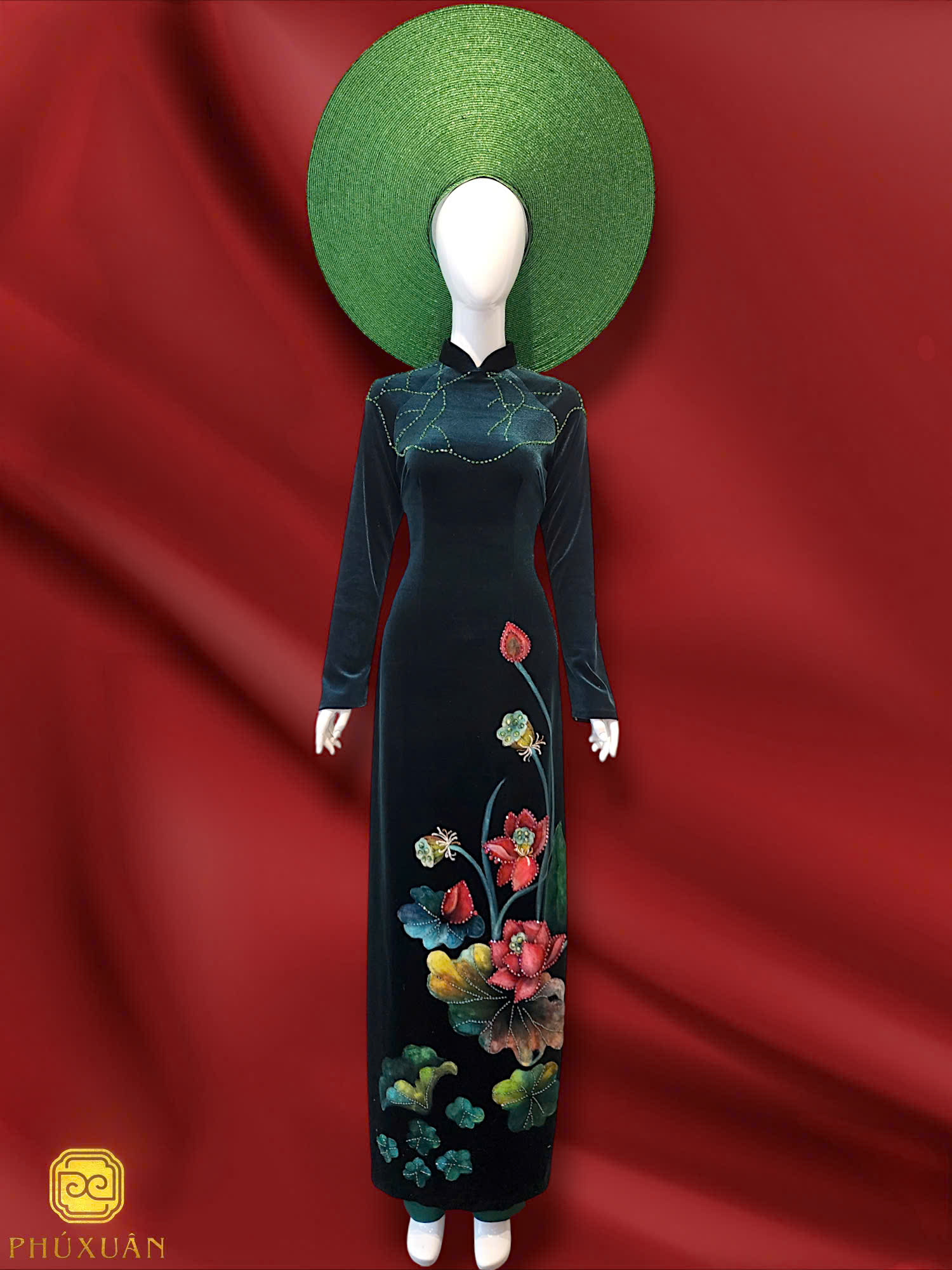 Chiếc áo dài nhung vẽ tay mang vẻ đẹp sang trọng và sâu lắng, kết hợp giữa chất liệu nhung mềm mịn và nghệ thuật vẽ tay tinh tế. Trên nền vải óng ánh, từng họa tiết được khắc họa nhẹ nhàng, tạo chiều sâu và cảm xúc. Mỗi tà áo là một tác phẩm nghệ thuật mang hơi thở cổ điển, tôn vinh nét đẹp quý phái, kiêu sa nhưng vẫn đậm đà bản sắc Việt.