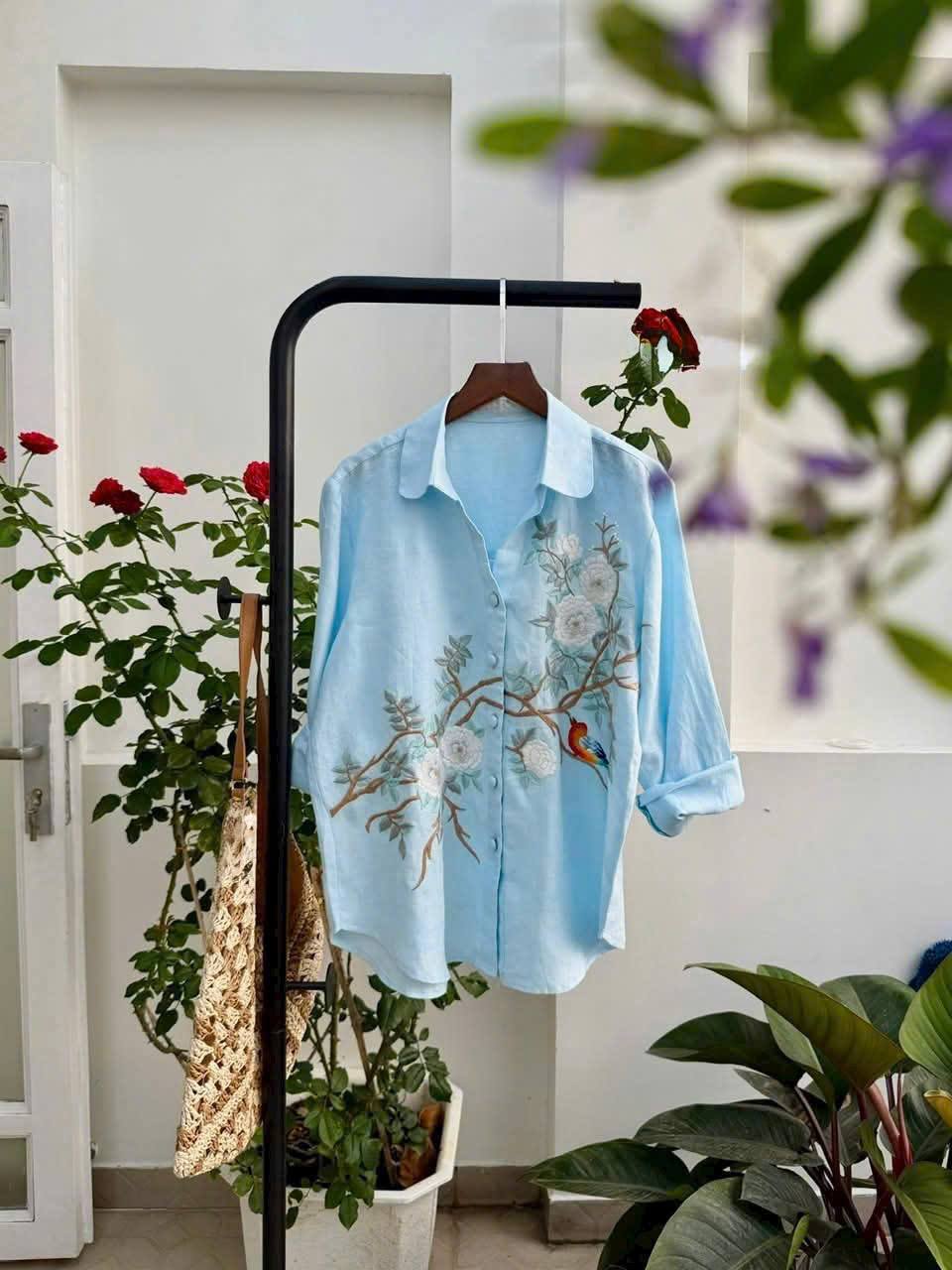 Áo sơ mi màu xanh thiên thanh thêu tay là thiết kế mang đến vẻ đẹp tươi mới, thanh lịch và đầy cá tính. Sắc xanh thiên thanh nhẹ nhàng gợi cảm giác mát mẻ, dễ chịu, phù hợp với mọi mùa. Họa tiết thêu tay giúp chiếc áo trở nên sinh động và thể hiện gu thẩm mỹ tinh tế của người mặc