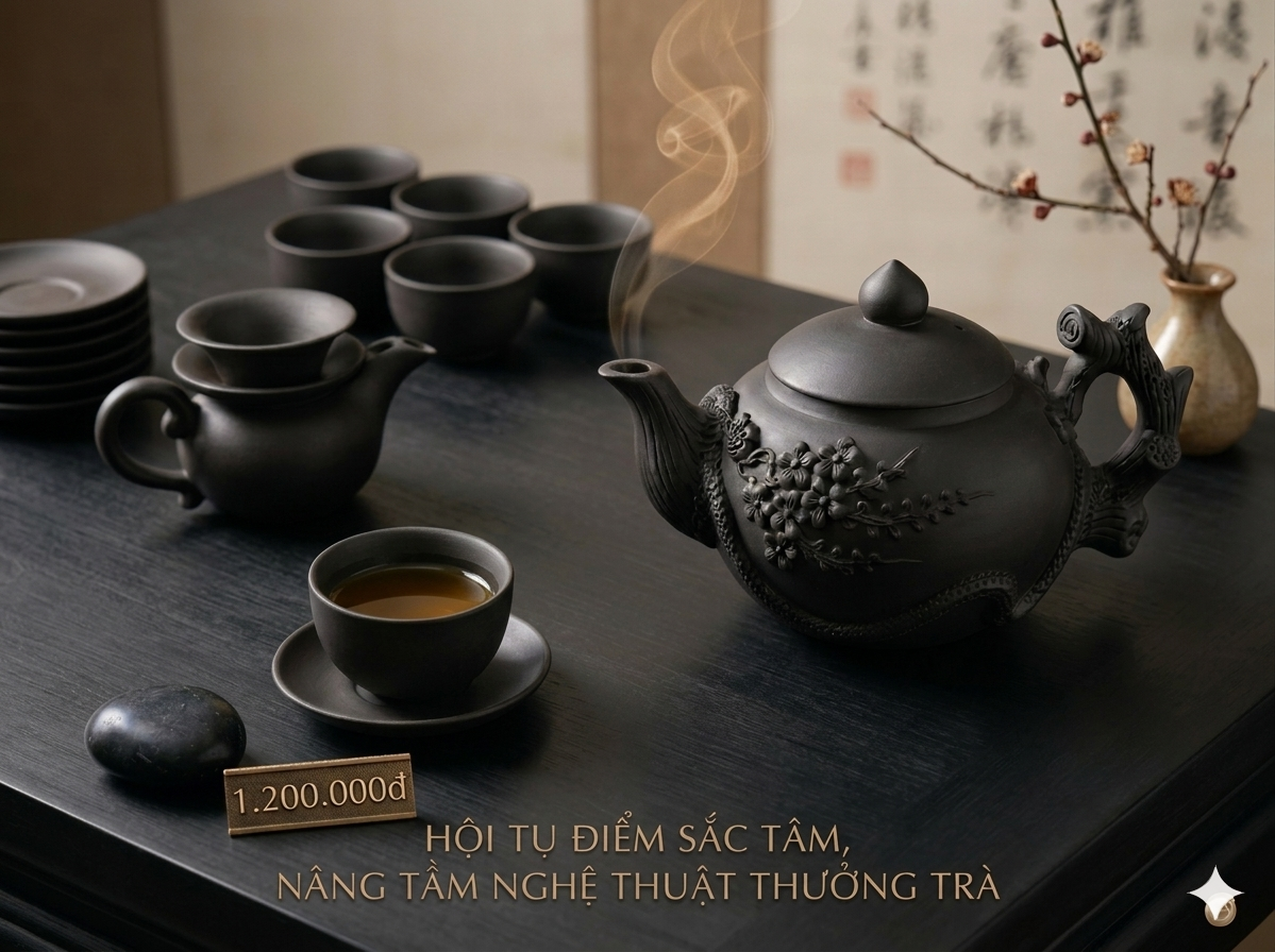 HẮC NÊ LONG MAI – BẢN GIAO HƯỞNG CỦA ĐẤT QUÝ VÀ NGHỆ THUẬT CHẾ TÁC Hắc Nê Long Mai không chỉ là một bộ trà cụ, mà là hiện thân của sự giao thoa giữa quyền lực uy nghiêm và nét thanh tao thuần khiết. Cốt cách quý hiếm: Được đúc kết từ dòng Hắc Nê nguyên khoáng – báu vật trong lòng đất, bộ ấm mang sắc đen huyền bí, sâu thẳm. Trải qua lửa đỏ nung nấu, chất đất ấy vừa mang vẻ vững chãi của khoáng thạch, vừa đem lại cảm nhận ấm áp, mịn màng khi chạm tay vào. Họa tiết độc bản: Hình ảnh Long Mai (Rồng và Hoa Mai) đắp nổi tinh xảo là biểu tượng cho sự cân bằng hoàn mỹ giữa Cương và Nhu. Rồng uy nghi tượng trưng cho sức mạnh, hoa mai thanh mảnh đại diện cho cốt cách cao sang, biến mỗi buổi trà chiều thành một bức tranh phong thủy sống động. Tinh hoa thưởng thức: Nhờ khả năng "thở" đặc trưng của đất quý, ấm Hắc Nê giúp đánh thức trọn vẹn hương vị nồng nàn của Oolong, Hồng Trà hay Phổ Nhĩ. Càng được chăm chút bằng nhiệt độ nước sôi lý tưởng và sự kiên nhẫn "dưỡng ấm", bộ trà cụ sẽ càng trở nên bóng bẩy, sâu thẳm, phản chiếu nội lực và sự tinh tế của chính chủ nhân. Hắc Nê Long Mai – Nơi tâm hồn tìm thấy sự an nhiên trong từng giọt trà, nơi giá trị độc bản được tôn vinh qua thời gian.