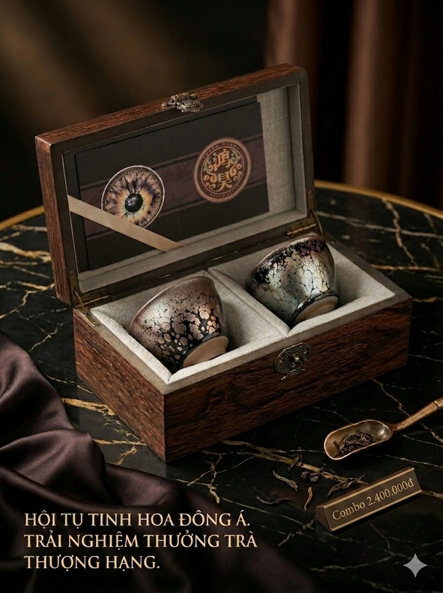 Giữa không gian trà thất thượng lưu, cặp chén Kiến Diệp Thiên Mục (Yohen Tenmoku) hiện thân như một huyền thoại sống, nơi "hội tụ tinh hoa Đông Á" trong từng đường nét. Được tôi luyện qua ngọn lửa thần trên 1300°C, lớp men Biến ảo (Yohen) tựa như một dải ngân hà huyền bí với những quầng sáng đa sắc, biến hóa kỳ ảo dưới từng góc nhìn và màu nước trà. Mỗi chiếc chén là một độc bản của vũ trụ; hàm lượng khoáng sắt cao trong xương gốm không chỉ làm "mềm" dòng nước mà còn đánh thức vị ngọt hậu thanh khiết nhất của những dòng trà thượng hạng. Nâng chén Thiên Mục trên tay, thực khách như đang chạm vào sự luân chuyển của thời gian và ánh sáng. Được đặt trang trọng trong hộp gỗ thủ công vương giả, bộ đôi này chính là món quà tinh tế nhất dành cho bậc tri kỷ, mang đến trải nghiệm thưởng trà đầy mê hoặc, nơi mỗi ngụm trà đều trở thành một chuyến du hành vào cõi mộng.