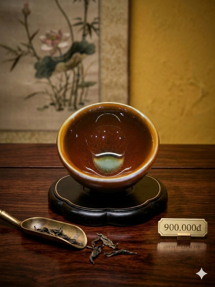 Kiến Diệp Thiên Mục: Tuyệt Tác Ngân Hà Trong Lòng Tay Chiếc chén là sự giao thoa kỳ diệu giữa đất giàu khoáng sắt và ngọn lửa thiêng trên 1300°C. Lớp men nâu huyết dụ sâu thẳm, điểm xuyết tinh thể kim sa lấp lánh, tạo nên một "dải ngân hà" độc bản — nơi mỗi chén trà là một thế giới riêng biệt. Không chỉ mê hoặc thị giác, hàm lượng sắt cao trong xương gốm còn giúp làm mềm nước, khử vị gắt, đánh thức sự ngọt hậu thanh tao của trà. Thưởng trà cùng Kiến Diệp là một nghi thức tĩnh tại. Khi dòng nước chạm vào lòng chén, sắc trà tương tác cùng lớp men tạo nên vũ điệu lung linh, huyền ảo. Với khả năng giữ nhiệt vẹn tròn và thiết kế dày dạn, chén không chỉ lưu hương bền lâu mà còn mang lại cảm giác ấm áp, vững chãi. Đây là báu vật dành cho người yêu cái đẹp, là mảnh ghép "Nhu" hoàn hảo bên cạnh chiếc ấm Tử Sa "Cương" nghị, tạo nên sự viên mãn cho mọi buổi trà chiều.